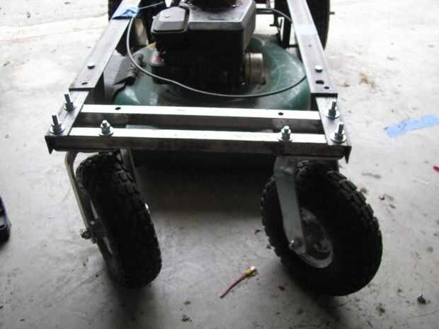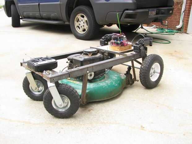 Primero usted necesita planificar la estructura de tu bot. Ya estaba dando una cortadora de césped, empecé por la medición de la altura que la máquina estaba parado sobre el suelo y tomó algunas medidas básicas para ver cuánto el marco necesario para ser. Mi marco resultada para ser aproximadamente 24" ancho (esta distancia debe coincidir con la anchura del centro de las ruedas trasera de la máquina) y 48" largo (tiempo suficiente para que las ruedas de la rueda hacer pivotar 360 grados sin tocar la parte delantera de la plataforma del cortacésped) y cerca de 18" de alto. Ya que queremos que la altura de la plataforma del cortacésped para ser ajustable, vamos para fijar la podadora a la estructura de desmontaje de las ruedas de la cortadora de césped y utilizando hierro de ángulo para suspender la plataforma del cortacésped de la estructura del bot.