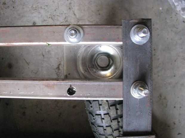 5. Taladre los agujeros y el perno estas 2 piezas al frente del hierro de ángulo de paso 1. Tienes que medir los orificios de las placas de montaje de la rueda 2 rueda y perfore el patrón de las barras del tubo frontal. Tornillo entonces las ruedas a través de esos agujeros en la parte delantera del bastidor.