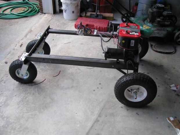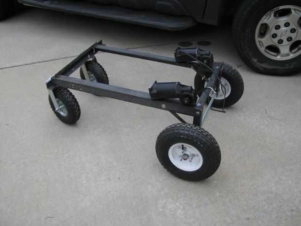 Ahora debemos tener un marco que se encuentra en su propia con 4 ruedas. Sin embargo, el eje trasero no es completamente seguro aún. Tendremos que añadir 2 tirantes desde la parte inferior de las tabicas de marco (cerca del eje) a la parte principal de la estructura para mantener las tabicas de marco en la posición correcta. Estos apoyos pueden ser planos y no es necesario ser muy gruesas, apenas mantienen las canalizaciones verticales de la estructura de movimiento.