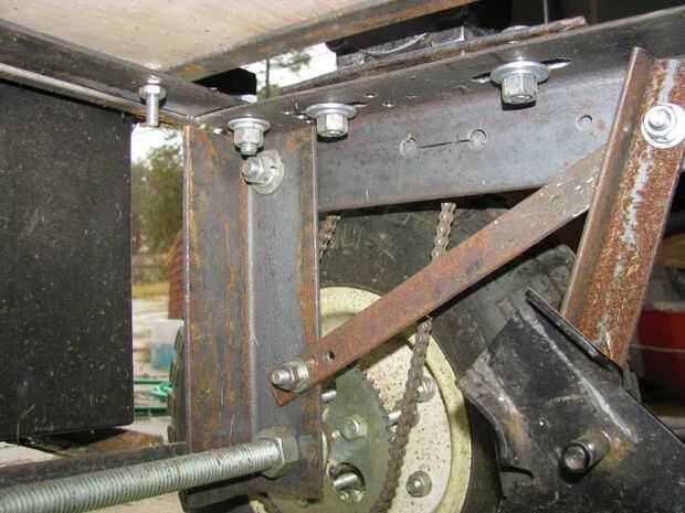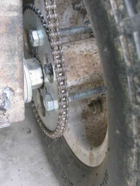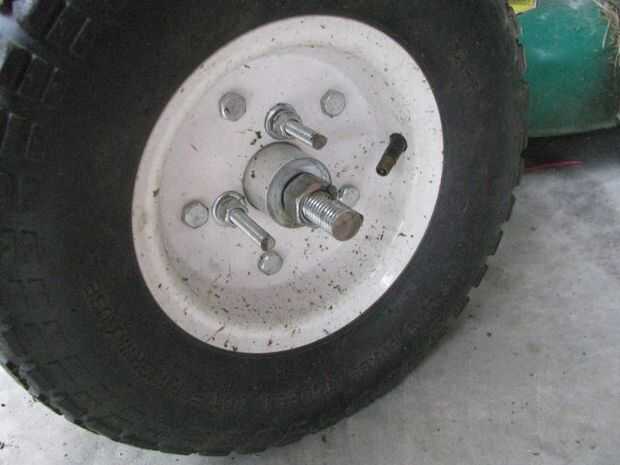 10. Ponga las ruedas en el eje y utilice 1 tuerca más en cada rueda para garantizar al árbol (estas ruedas han construido en los rodamientos). Los piñones deben mirar hacia adentro hacia el marco.