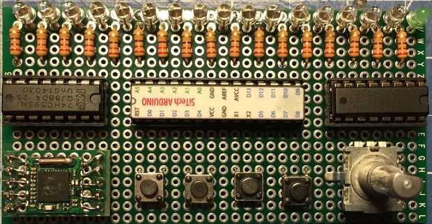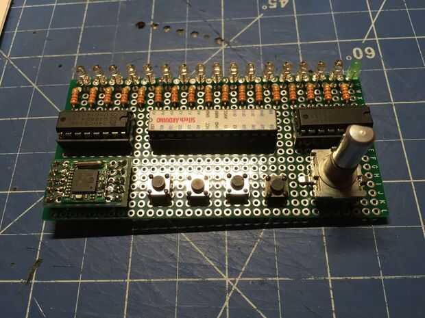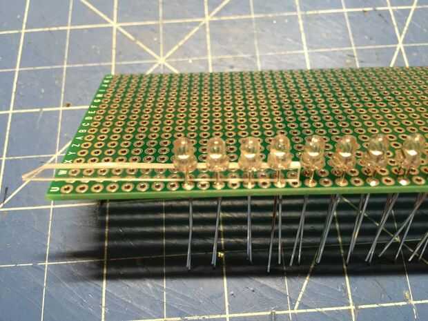 2. después de soldar los LEDs y las resistencias que comencé a colocar las otras partes durante esta etapa no pensé mucho sobre donde las piezas tienen que ir a hacerla más fácil soldar solo queria que parece "cool" para mí, sólo el 74HC595 he colocado boca abajo por lo que las "salidas" fue cerca de las luces LED. Esta es la segunda foto