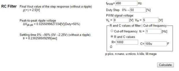 El filtro RC tiene dos valores que determinan cómo le modula la señal PWM: R, la resistencia en ohmios y C la capacitancia en faradios. Hay muchas herramientas en línea para explorar circuitos RC. Una que es útil es http://sim.okawa-denshi.jp/en/CRtool.php, desde el diseño electrónico de Okawa y fabricación en Japón.