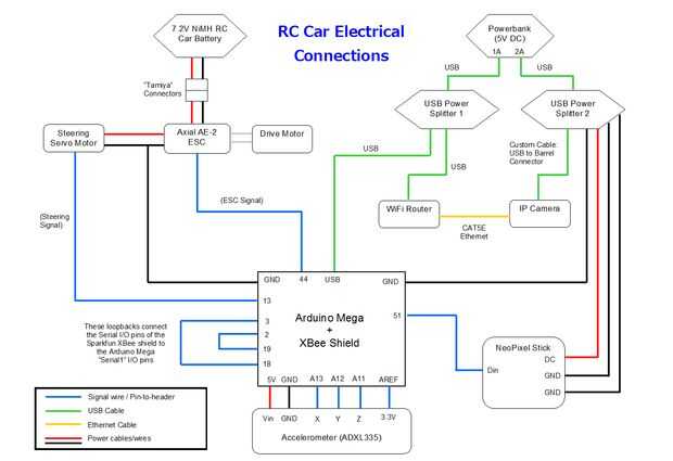 El último diagrama muestra un resumen completo de los cables / cables en el coche, incluyendo los pines de Arduino Mega que se utilizaron.
