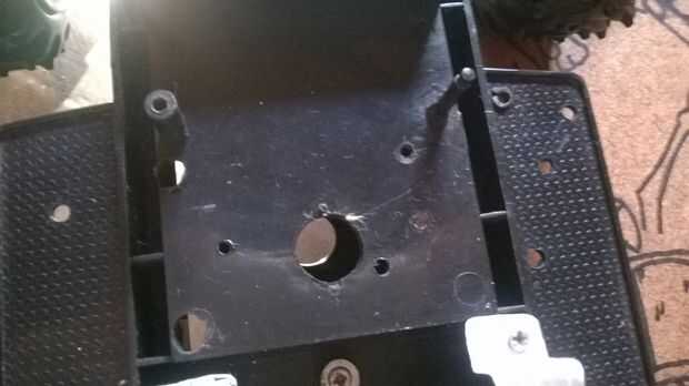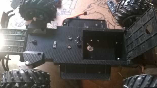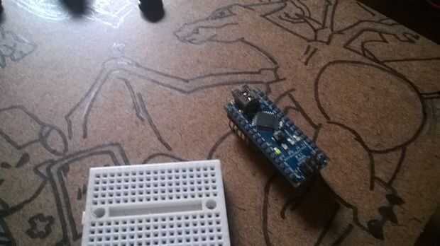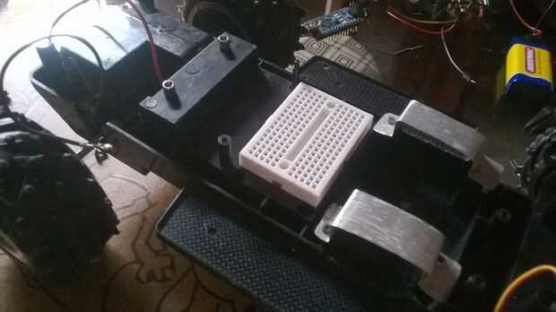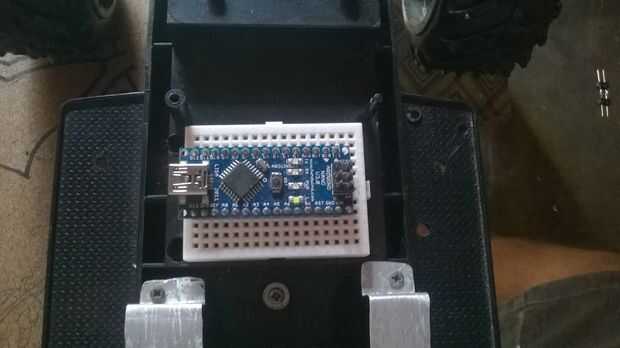 Un protoboard mini fue atornillada al chasis, ya tenía agujeros, sólo utilicé un Dremmel para hacer agujeros en el chasis. Luego el Arduino Nano fue montado en la protoboard mini macho a hembra cables fueron utilizados para conectar los otros componentes a la placa.