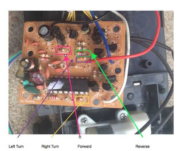 El primer paso que tomé fue a identificar el giro a la izquierda, derecha, adelante y hacia atrás. Hice esto por la conexión de un cable demasiado GND (tierra) al tocar el otro extremo en diferente soldadura parches en el circuito.