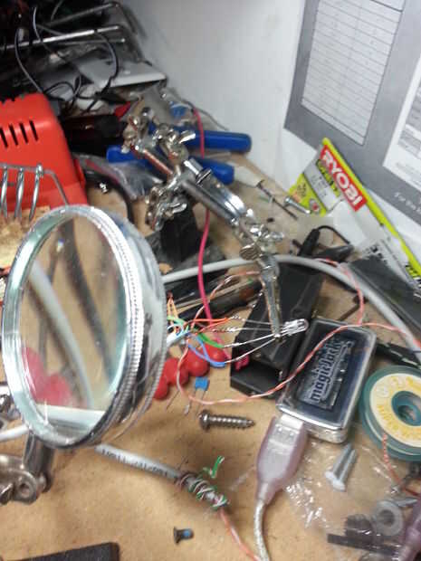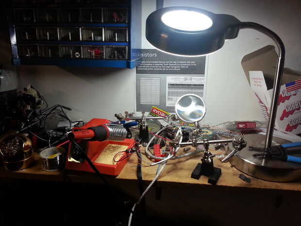 Configurar su estación de soldadura. Utilizo el poco 'manos con lupa' a mantener los componentes en su lugar para mí. Solía tener mi esposa mantenga cosas para mí cuando empecé en mi primer departamento de soldadura. Es muy conveniente tener dos de estos 'a mano'. Tengo que sujetar a mi espacio de trabajo para evitar que se vuelque con el peso de alambre y componentes en ellos, son luz. Una luz ajustable decente con una lupa en así es agradable. En alguna parte alrededor de $25 en la electrónica de Fry. No tengo mis códigos de color del resistor memorizados aún. Aprendido demasiado tarde en la vida que supongo.