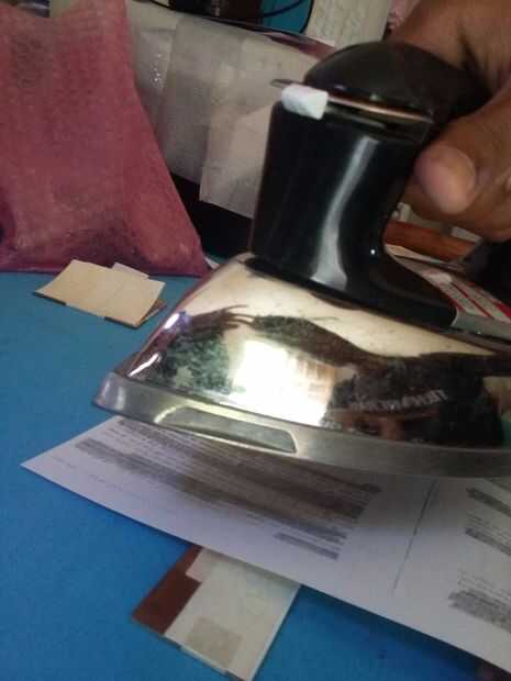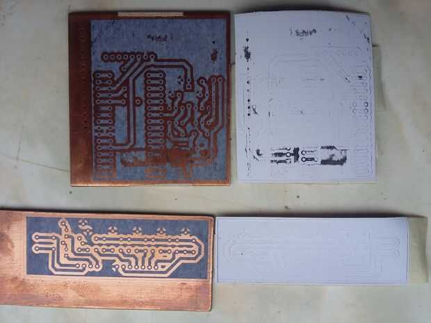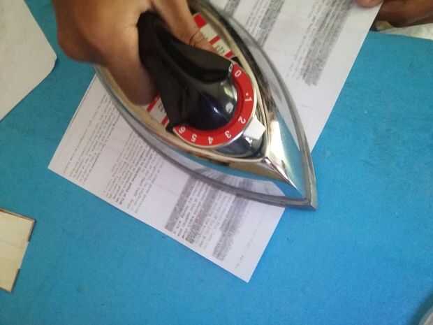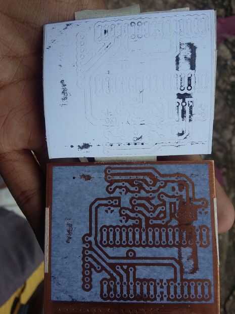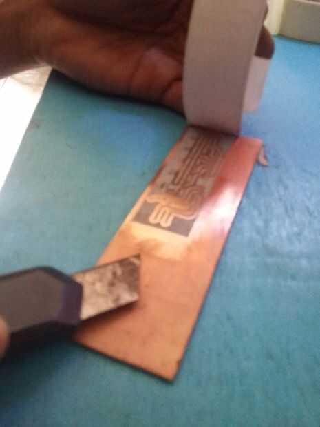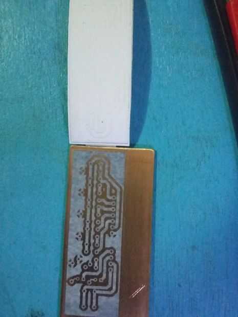 Hacer estos pasos para ambos la platina (placa base y teclado). Utilizar una lavandería a hierro el esquema de la PCB. Planchar el diseño transfiere la tinta del papel a la placa. Necesita temperatura de la plancha a la temperatura más alta si el papel es grueso y medio ambiente si su papel es delgado. A veces, es necesario a su disposición a la Junta para evitar que se mueva la cinta. Agregar capa adicional de papel entre la plancha y el diseño es opcional. El diseño del hierro hasta que se traspase la tinta. En mi caso, estoy utilizando un papel de la foto, después de 5 minutos de planchado, intento de despegue el papel y sale fácilmente. Algunos prefieren tomar la junta con agua primero y luego retire el papel. En mi experiencia, empapar con agua da un trabajo sucio que sólo cuidadosamente despegando mientras su tranquilidad caliente (es decir tolerable). No olvide verificar el PCB para caminos desgastados, restaurarlos usando un marcador. Yo prefiero cortar el PCB a su tamaño después de lo grabado. Esto es para evitar que se dañe el diseño.