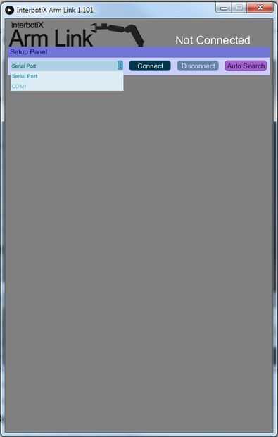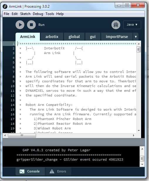 ARMLink.pde. 3 de procesamiento debe abrir una ventana con el código de enlace de brazo InterbotiX. - Presione el botón de triángulo en la esquina superior izquierda de la ventana. Esto ejecutará el Software de enlace del brazo.