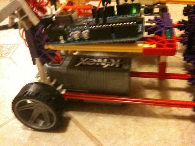 Así que ahora tengo un robot por no mucho dinero que puede ser "creado" por los estudiantes utilizando los bloques de edificio de un kit de K'nex. Entonces puede programar en modo arrastrar y soltar en cero!