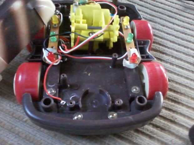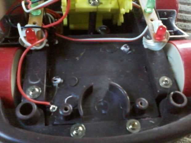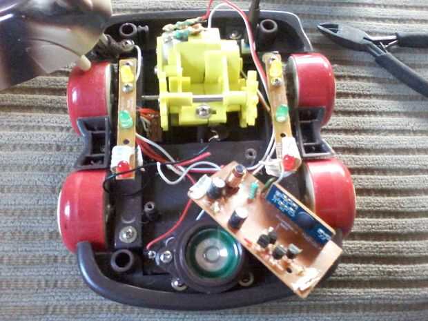 Una vez que el coche se separa, vas Desatornille y extraiga la placa de circuito. Usando tijeras de hojalatero vas a cortar los cables que van a la platina lo más cerca del tablero como sea posible. Ahora que se retira la placa de circuito vas a quitar el altavoz situado en la parte delantera. Dos tornillos y tu bien ir. Ahora finalmente utiliza sus tijeras para cortar los dos post de plástico situado dentro del marco del coche. Es necesario retirarlos para caber el arduino en.