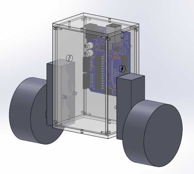 El cuerpo de la robusteza fue diseñado en Solidworks, con la intención de que sea relativamente fácil de cortar y ensamblar usando un cortador láser. También se decidió diseñar el cuerpo con un alto centro de la masa mediante la colocación de los componentes principales en la parte superior de la Asamblea, para mejorar la facilidad de equilibrio. Archivos de SolidWorks pueden encontrarse Unido.