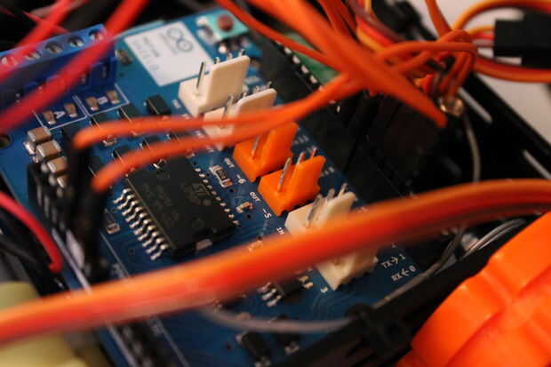 Cañón de agua arduino robotPaso 1: Arduino Uno R2Arduino MotorshieldBomba de aguatubo flexible6 x pilas AA NiMhCaja de la batería 2 AACompartimento para 4 AAServo 9 g x 2Chasis Robot de 2WDRelé de 5VMando a distancia IRIR reciviocables dePaso 2:
