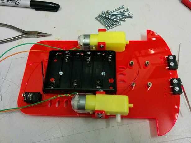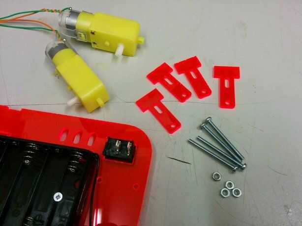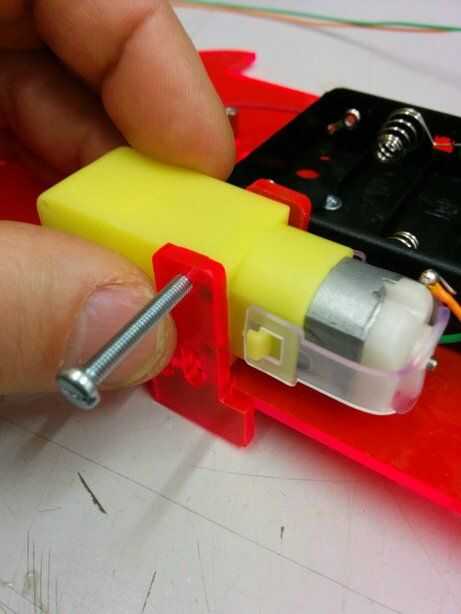 Fijar los motores que utilizan los soportes de motor plásticos. Uno de ellos se ajusta a través de la ranura y el otro tiene una muesca para detenerlo hacia abajo.