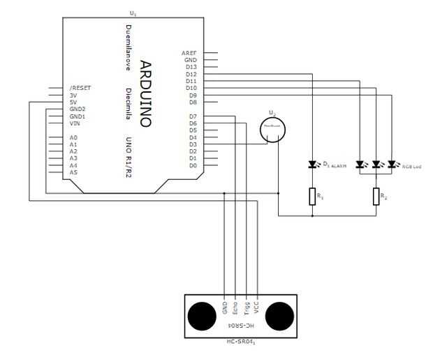 La solución que he elegido es que el sensor entero + arduino + LEDS dentro de una sola caja de plástico, instalada en la parte superior de la tapa, pero también puedes decidir poner el SRF05 sobre la tapa y Arduino en otro lado. En este caso debe proteger adecuadamente cable y circuito SRF05.