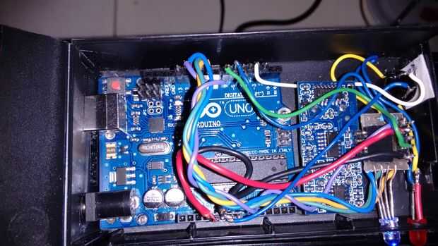 Ahora echa un vistazo a las fotos para hacer otros agujeros a la caja como el poder y los conectores USB de un lado (junto a donde pones placa Arduino), los dos agujeros de LED (hacia delante), a continuación fijar placa Arduino a la caja con un par de tornillos y espaciadores. Ahora hacer de cableado según los esquemas anteriores: