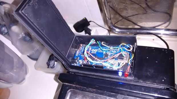 Luego haga agujeros idénticos en la caja externa de plástico, para que SRF05 sensor será capaz de "ver" dentro del tanque mientras que los otros componentes será con seguridad dentro de la caja, protegido de cualquier contaminación del agua. Cápsulas de ultrasonidos no deben moverse así que prestar atención a evitar hacer demasiado agujeros Heydon (mientras los agujeros apretados no le encajen totalmente), en caso de utilizar un poco de pegamento caliente para fijar.