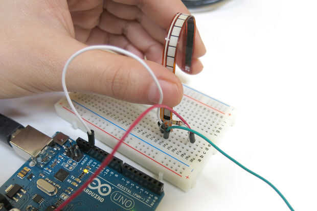 Sensores de flexión son otro tipo de resistencia variable, puede ser cableados en exactamente la misma forma que la sensible a la luz y resistores sensibles de presión. El flex de sensores que utiliza en clase tienen una resistencia entre 10kOhm-20kOhm, por lo que debe combinarse con una resistencia de aproximadamente el mismo valor. El código de la luz resistencia sensible paso será trabajar con flex sensor, pero no olvide ajustar el 0, 900 en la línea: