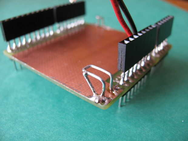 Si completa el paso anterior, usted tiene el módulo de batería independiente ahora. Puede ser utilizado en muchos proyectos diferentes. Y esa es la razón por qué no quiero conectar el módulo de batería a un escudo de proto permanentemente con un pegamento. En mi caso el módulo de batería se une al escudo sólo por 'ayudar a los titulares de'. Estos 'titulares' son de clips de metal dobladas y soldados a mi escudo de proto 'dummy'. Vea las figuras anteriores. Funciona bastante bien.