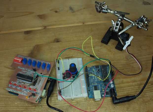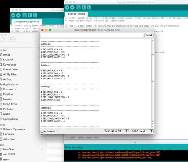 Para probar una filtrado señal analógica usando una curva de desaceleración y aceleración estable, he utilizado un segundo Arduino (Duemilanove versión) con un dibujo sencillo mover un servo micro siguiendo la variación de un PIN de entrada analógica. El bosquejo DigiPot_ServoTest puede descargarse desde esta página.