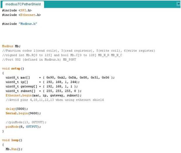 La comunicación de modbus TCP realiza leer registros y escribir registros de 16 bits que hay que crear en la biblioteca de mudbus en el programa de arduino como este: