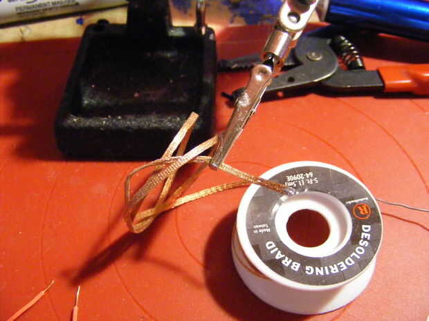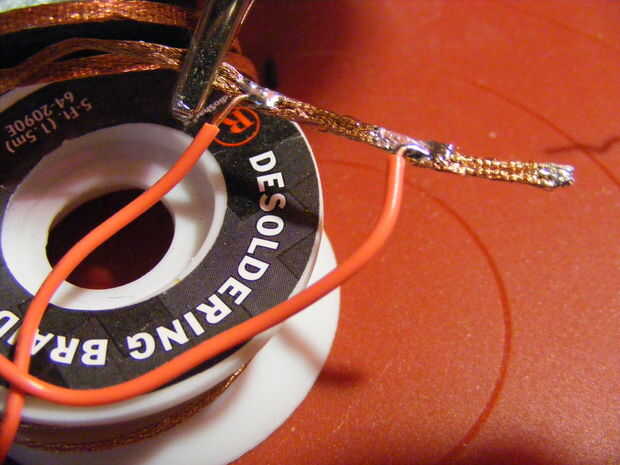Mecha de soldadura (desoldering braid) es un producto trenzado de hilos finos de cobre. Supongo que se podría clasificar como un hilo conductor muy muy grueso. Su único uso parece ser que fue diseñado para desoldar las operaciones para impregnarse de soldadura fundida para retirar de los circuitos. Queremos hacer lo contrario.