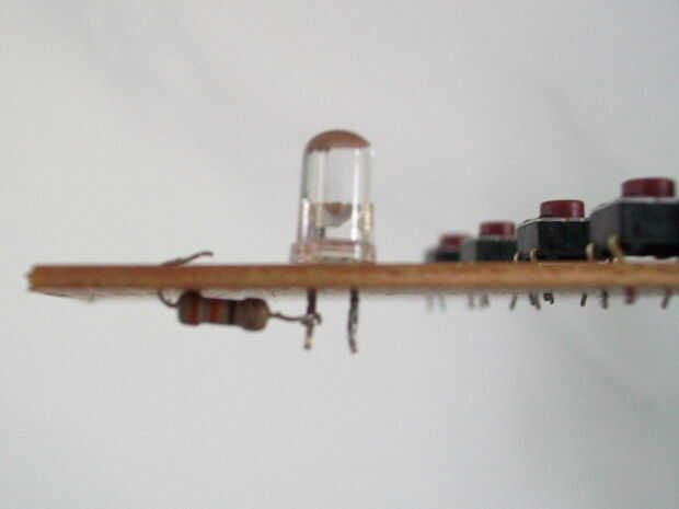 Poner el LED, el cátodo conectar el pulsador, conectar el ánodo a la resistencia. Estoy usando resistencia de 330 Ohm, porque quiero que mi LED no tan brillante. Para la resistencia, lo pongo al revés en para eficiencia con el recinto. (ver imagen 2 y 3)