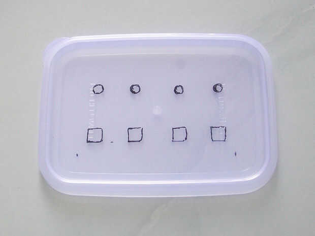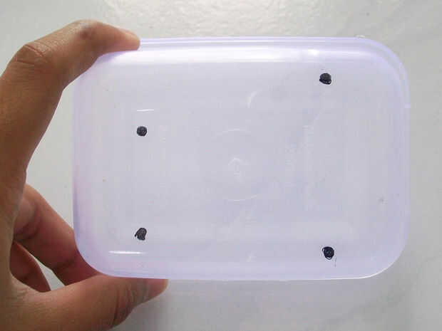 Dibujar el patrón en la caja de "Mercancías de la cocina" con marcador para colocar al espaciador para Arduino. Es realmente ayuda para la perforación. (Ver imagen 1 y 2)