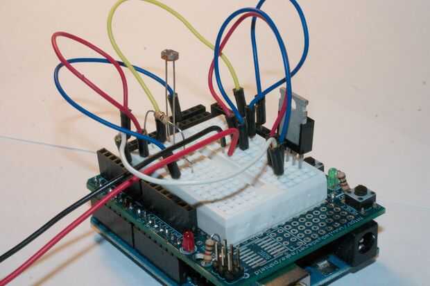 Una pierna de la fotorresistencia está conectada al pin analógico 0 (puente amarillo) y a tierra, resistencia de 10 k entre. Su otra pata se conecta a 5V.