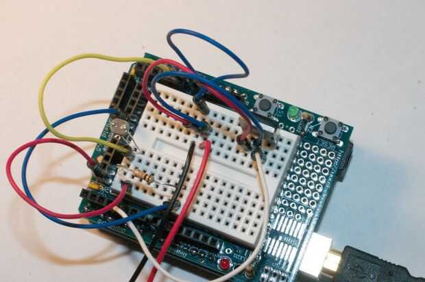 La pata de la puerta del transistor está conectada al pin digital 5 (puente blanco). Las otras dos patas forman un circuito con el transmisor (puentes rojos y azules). Que el circuito también está conectado a arduino de tierra. ACTUALIZACIÓN: Tal como se describe, el circuito a veces continuamente desencadenaría la campana. Agregar una 10k resistencia entre el circuito del transmisor y la tierra (en lugar de la tierra directo) había corregido el problema.
