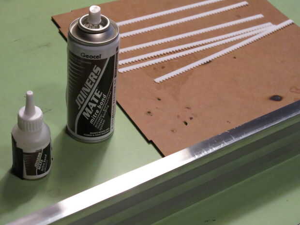 Utilizando un pegamento llamado a Mate de carpinteros, pegué secciones del riel al borde del carril deslizante. Puedes ver los que probaron una sección y una vez que conocía la posición exacta pegué el resto a toda la longitud del riel.