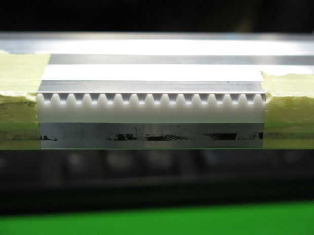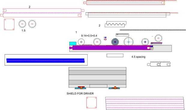 Trabajé desde el engranaje estándar decidió para los componentes a anterior y adaptado en CorelDraw, para un carril linear. Tuve que hacer el carril lo bastante estrecha como para no chocar con los rodillos.