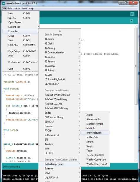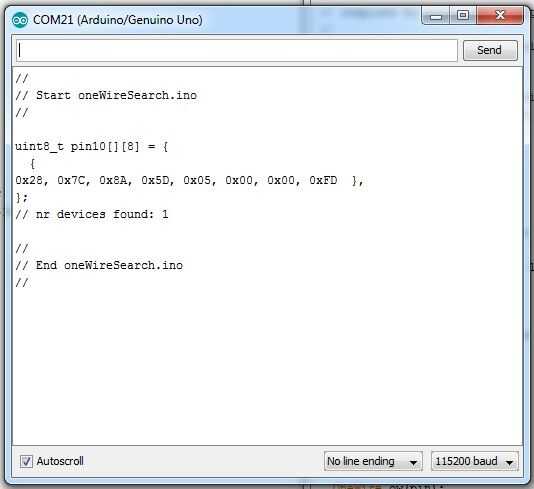 Descargar e instalar la biblioteca de Dallas temperatura (buscar la interweb última versión). Luego utilice el programa oneWireSearch para encontrar la dirección de la sonda.