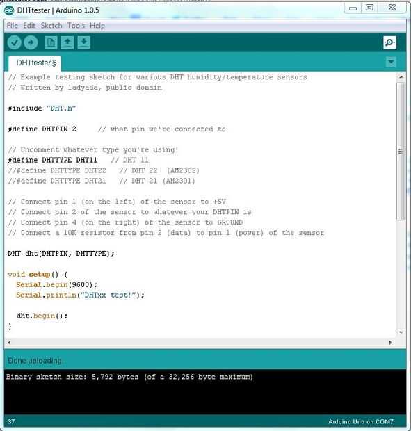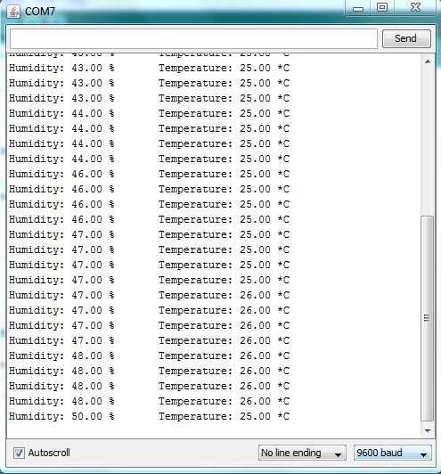 - Subir el bosquejo a continuación, abra la ventana de serial. Debería ver la temperatura y la humedad nivel de desplazamiento. Si respiras en el sensor debería ver la temperatura y humedad en aumento. Tardará unos segundos como el sensor es lento.