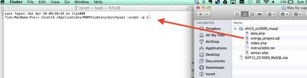 Ahora, arrastre el archivo de energy_project.sql (véase la foto de arriba) situado en la carpeta sht15_cc3000_mysql en htdocs sobre la ventana de terminal - Esto pegará la ruta (ubicación) del archivo energy_project.sql en la ventana de terminal después de la <
