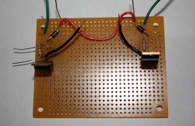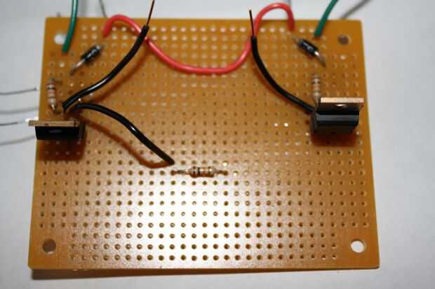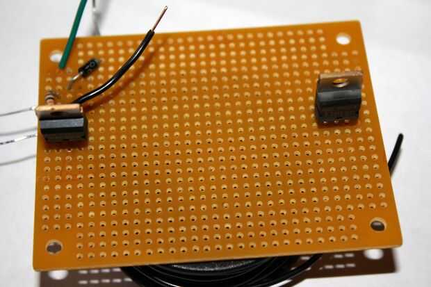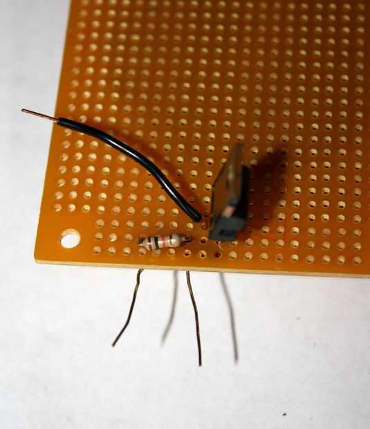 3. la derecha el tablero y coloque uno de los resistores de 10K para que una pierna está en línea con el pin de la base en el TIP120. Soldar en su lugar.