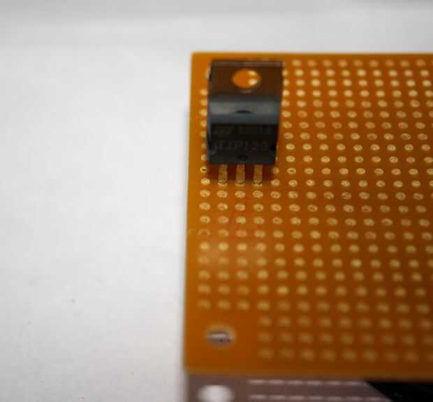 1. Inserte uno de los transistores de Darlington TIP120 en un lado de la Junta, asegurándose de que las piernas que son. Con el texto hacia de izquierda a derecha las piernas son: Base, colector, emisor. También debe ayudar a las cosas un poco más de lo que tenía como puntos de conexión Lleno juntos se convirtió en un dolor para trabajar en espacio.