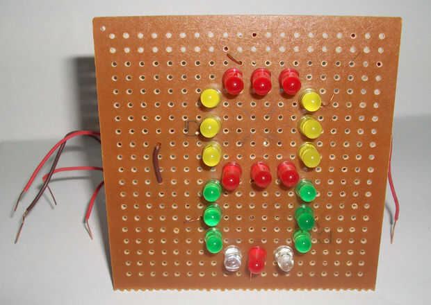 Colocar el LED en perfboard. Cada segmento tendrá 3 LED con cable paralelo entre sí. Cuidado con los cables positivos y negativos, los aspectos positivos de estos LEDs son todos conectados en paralelo. (Ver imagen 2)