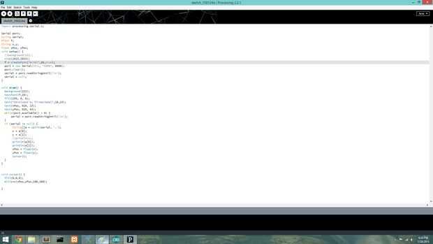 Serial port; String serial; PFont f; String x,y; float xPos, yPos; void setup() { //background(222); size(1920,1080); f = createFont("Arial",16,true); port = new Serial(this, "COM3", 9600); port.clear(); serial = port.readStringUntil('\n'); serial = null; }  void draw() { background(222); textFont(f,20); fill(255, 0, 0); text("Developed by FirmanJamal",10,23); text(xPos, 920, 23); text(yPos, 920, 43); while(port.available() > 0) { serial = port.readStringUntil('\n'); } if (serial != null) { String[]a = split(serial, ','); x = a[0]; y = a[1]; //println(x); println(a[0]); println(a[1]); xPos = float(x); yPos = float(y); cursor(); } }  void cursor() { fill(0,0,0); ellipse(xPos,yPos,100,100); }