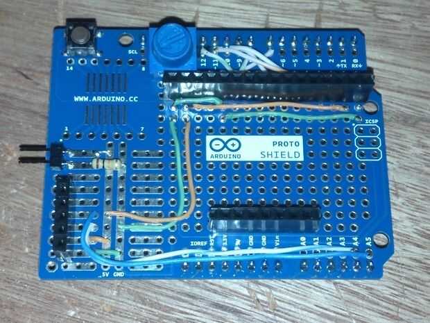 El RTC fue mucho más fácil de conectar. Había soldado la cabecera hembra de 5 pines las barras cortocircuitadoras junto a los autobuses de corriente y tierra. Los pines en el módulo RTC están etiquetados, por lo que conectado a GND a tierra, 5v a 5v y SDA y SCL de Arduino A4 y A5 respectivamente.