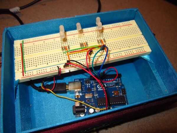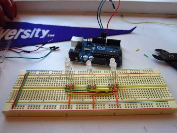 Por último, he preparado la placa con LED RGB 5 (2 grupos de 2 LEDs en paralelo y otro solo). Ya que intento ser tan organizados como sea posible con mis cables, que clase de conectado todo a través de cables, por lo que pude una necesidad de usar 3 pines digitales para todos los LEDs (cada pin digital representa un diverso color = rojo, verde, azul), 3 cables para el sensor de temperatura (usado 2 cables conectados a la placa – alimentación y tierra – y 1 pin analógico) y más 2 cables conexión protoboard para la alimentación de 5V y la tierra.