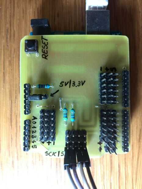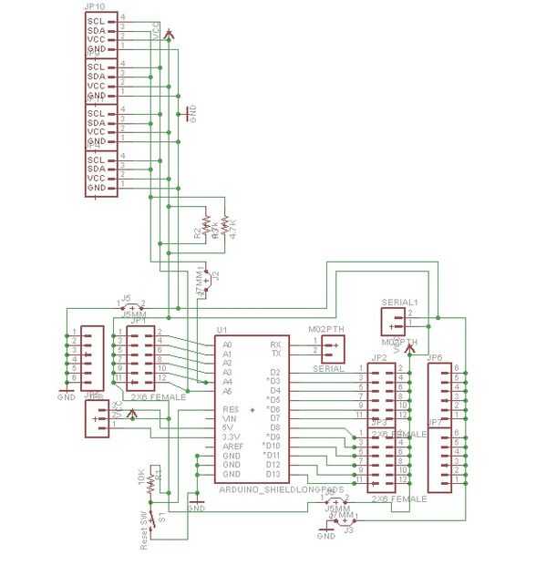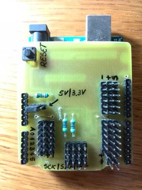 Si usted mira de cerca el esquema he añadido clavijas para 4 dispositivos i2c con las correspondientes resistencias de 4,7 K, un selector de voltaje de 3.3V o 5V y patillas D0 y D1 son compatibles con módulos bluetooth serial como HC-06 tengo puesta alrededor.
