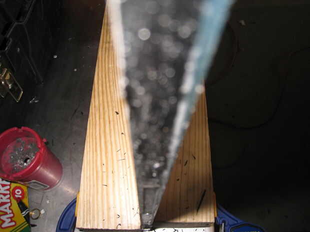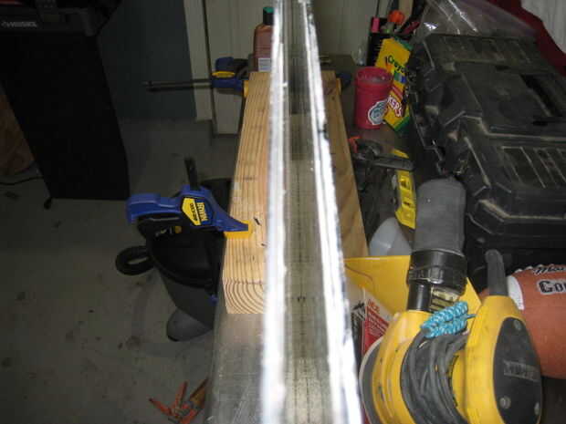 Sujeción de la ventana entre 4 x 4 que era capaz de crear un buen espacio de trabajo. El caucho fue dañado a lo largo de los lados de la ventana y de la violación mencionada en el sello de aluminio en un lado. Con una cuchilla de afeitar, quité la goma restante que cubrió los cuatro lados exponiendo el sello de aluminio. A continuación, el lado de la ventana que la violación fue un punto de partida para la designación de un "top". Usé los alicates de nariz de aguja y unas tijeras para pelar el aluminio y cortar aproximadamente 4" de cada uno de los extremos. Esto se utilizará eventualmente para la iluminación y el acceso de hábitat. Dejé el 4" a cada lado para ayudar con las hormigas renegadas que pueden romper las leyes de la gravedad y escape containment.*