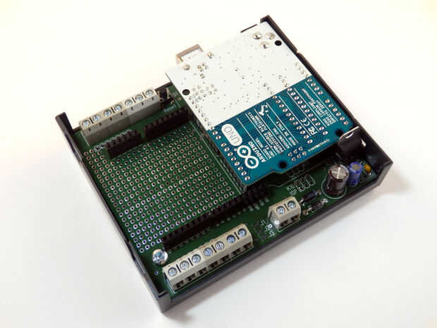 Nuestros kits DIY Open ArduiBox no sólo son adecuados para albergar una placa Arduino y montaje en carril DIN. ArduiBox viene con un tablero y un regulador de voltaje de 12V DC (Vin Arduino). A lo largo de los bordes del proto pins zona, todos la IO y el poder estén conectados y marcados. Además usted puede pegar un escudo Arduino a la placa principal. Puede conectar su trabajo por medio de terminales con el mundo exterior del recinto. Aquí están las características principales de nuestro juego: