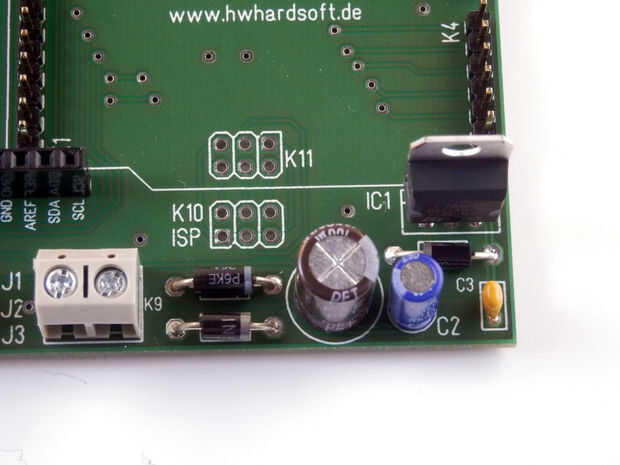 El Arduino sólo puede manejar voltajes de entrada de 9 a 12 VCC. En un gabinete de control generalmente tenemos un voltaje de control de 24 v CC. Ofrecemos un regulador de tensión opcional para Arduibox que permite el Arduibox para tensiones de entrada de 15 a 30 v CC