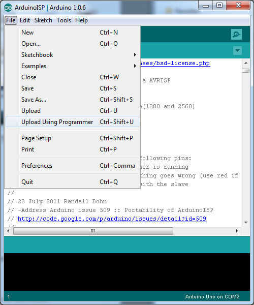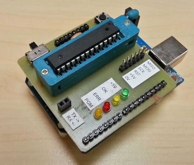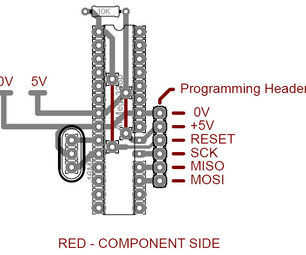 El mismo método puede utilizarse para programar un AtMege328P en un circuito independiente (protoboard o tablero de PC) usando el cable de programación. Para los circuitos independientes, normalmente es necesaria que se encienden a través de su propia fuente. Si la fuente no está disponible, y el circuito no requiere mucha potencia, el circuito puede ser energía de la pantalla de programación encendiendo el + 5V