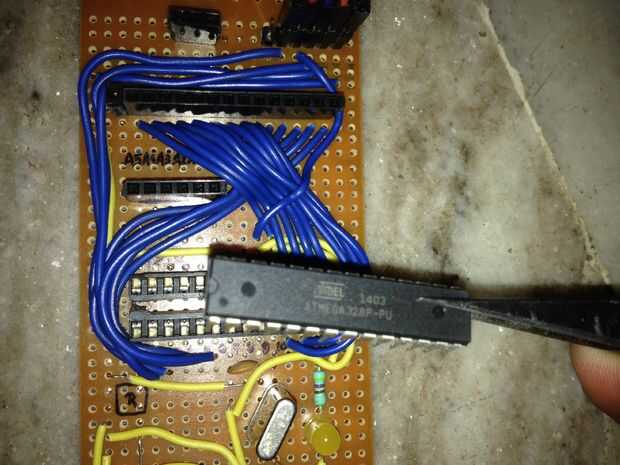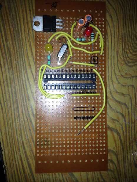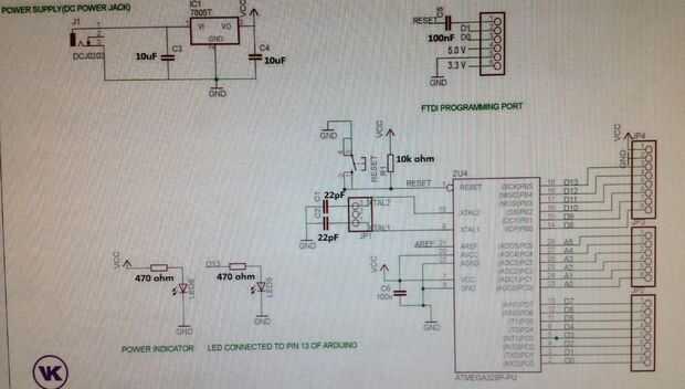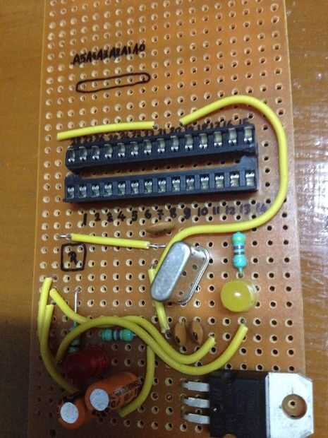Mira bien el circuito y soldar los componentes en el tablero. Por cierto, este esquema no es mío, i sólo han editado esto y corregir sus errores. Tratar de minimizar el uso de los puentes. No hay nada más difícil en este paso. En primer lugar, poner los respectivos LEDs, cristal y los condensadores de filtro y regulador de voltaje. Puede utilizar los condensadores más que el valor dado para la mejor filtración como 47uF, etc... Otra cosa para notar aquí: por favor no confundir entre el ATmega y Arduino Pin números en el diagrama del circuito. En realidad, pin13(D13) digital de arduino es pin del chip ATmega Nº 19 y así sucesivamente... Amigo, no tenerlo ligeramente o vas a arruinar tu Consejo!! Por último, compruebe todos los pernos y soldadura de puntos con probador de continuidad por cortocircuitos o fallas antes de triunfo al siguiente paso!!
