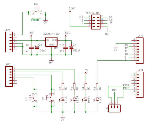 Nada demasiado complicado. Es un diseño de escudo estándar, con un a bordo LM2937 3.3V regulador para el módulo nRF24. El módulo nRF24 se conecta a un conjunto de conectores de cabecera.