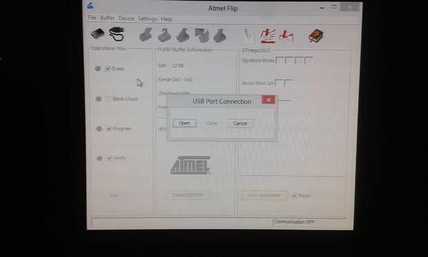 a continuación van a FLIP y seleccionar dispositivo como atmega16u2