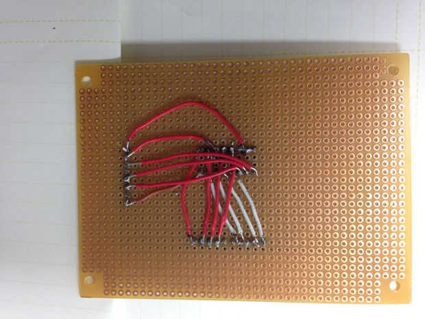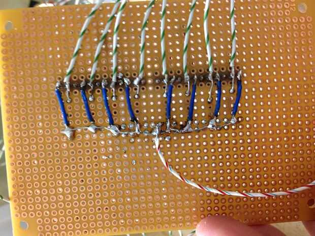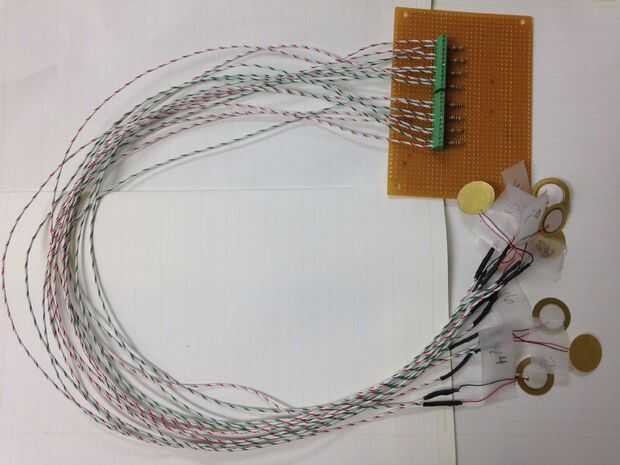 Cada piezoeléctrico tiene un positivo y un negativo. El positivo se conecta a una resistencia que se conecta a tierra, y el negativo se conecta directamente a tierra. El terreno común está conectado a la tierra misma como en la protoboard multiplexor y alambres separados están soldados a cada uno de los cables de positivo piezoeléctrico y en el tablero de mutliplexer.