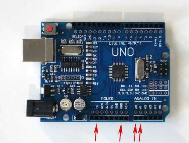 5. Conecte el cable de alimentación(cable rojo) con el conector de poder de 5V(llamado IOREF en la mayoría de los foros) de la placa de Arduino (foto 2)